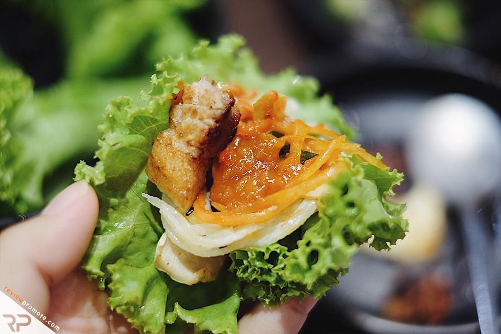 วิธีทานก็ง่ายๆ เอาผักมาห่อเนื้อหมู ตามด้วยเครื่องเคียงต่าง ๆ ที่เราชอบ แล้วก็ อ้ำ!!!