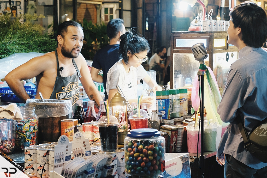 เดินมาซักพักก็เจอร้านขายน้ำที่คิวยาวววววมาก คนมุงดูเยอะมาก เลยไปมุงกะเขาซะหน่อย เค้ามีอะไรดีทำไมคนเยอะ ก็เจอพ่อค้าหน้าตาคุ้นๆ เค้าคือพ่อค้าเยสเข้ แห่งตลาดนัดรถไฟนี่เอง เอกลักษณ์การขายคือการพูดหยอกล้อกับลูกค้า มีคำหยาบคายบาง แต่พอพูดเสร็จเค้าก็ขอโทษลูกค้า เหมือนเป็นการพูดเล่น ๆ ขำ ๆ กัน สร้างรอยยิ้ม เสียงหัวเราะจากคนรอบข้างได้อย่างดี มิน่าละ ลูกค้าถึงเยอะขนาดนี้ น้ำที่ถูกสั่งบ่อย ๆ คือ แดงมะนาวโซดา