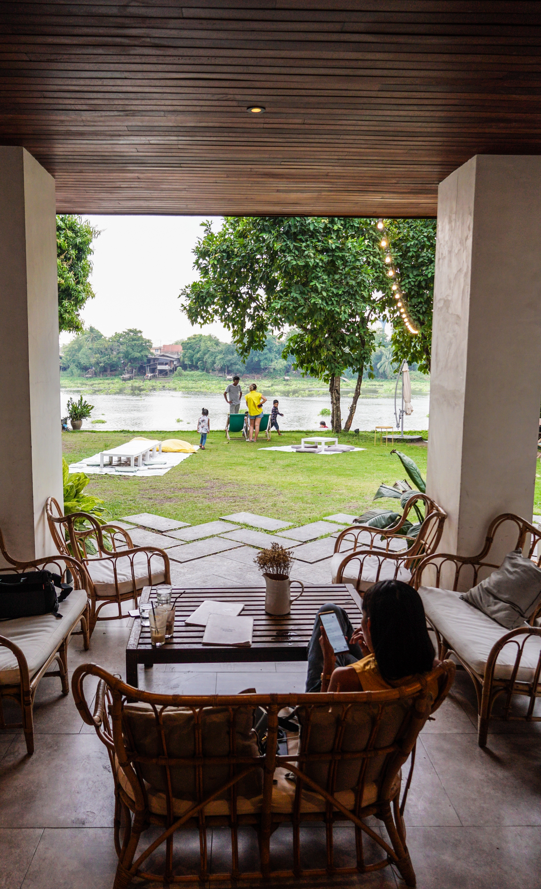 - ที่นั่งริมน้ำ บรรยากาศดี แต่ตรงสนามหญ้า มีเสื่อปูนอนได้ชิวๆ