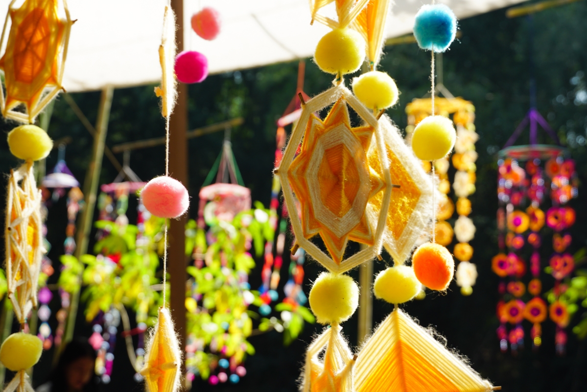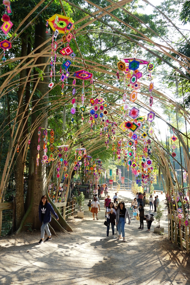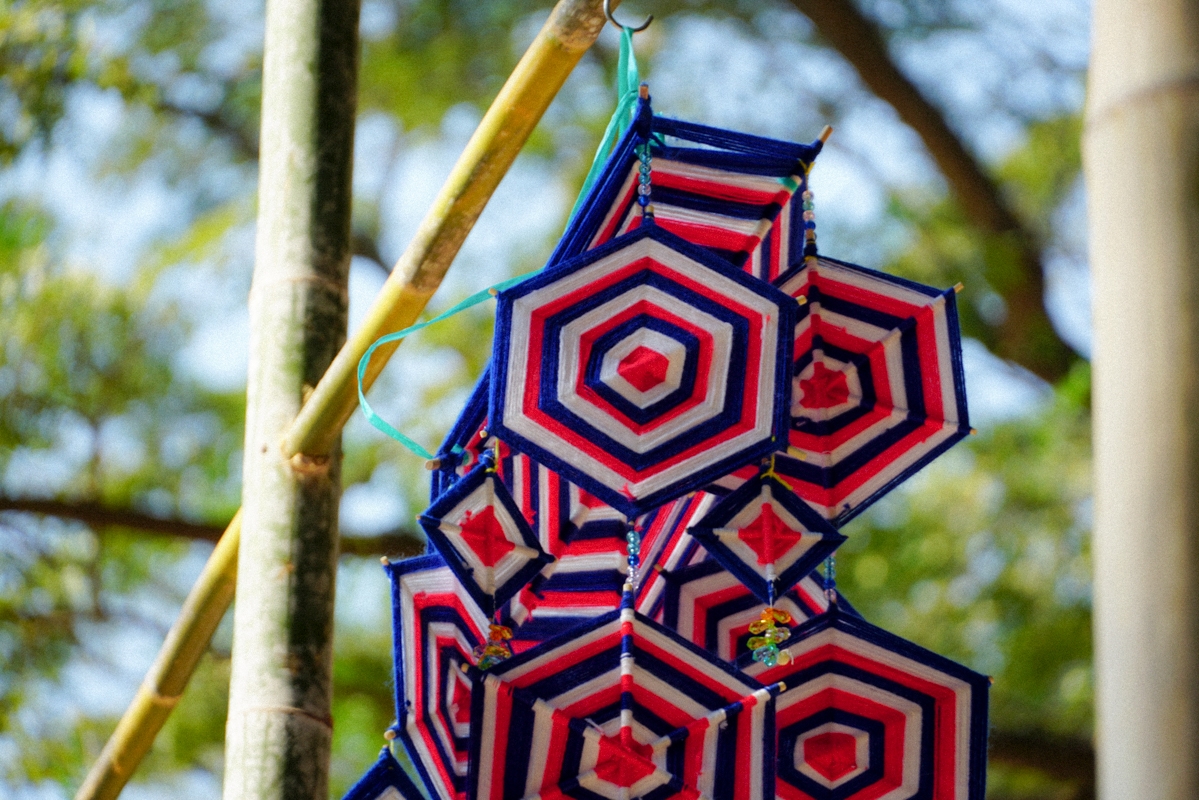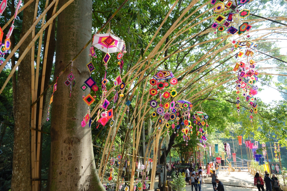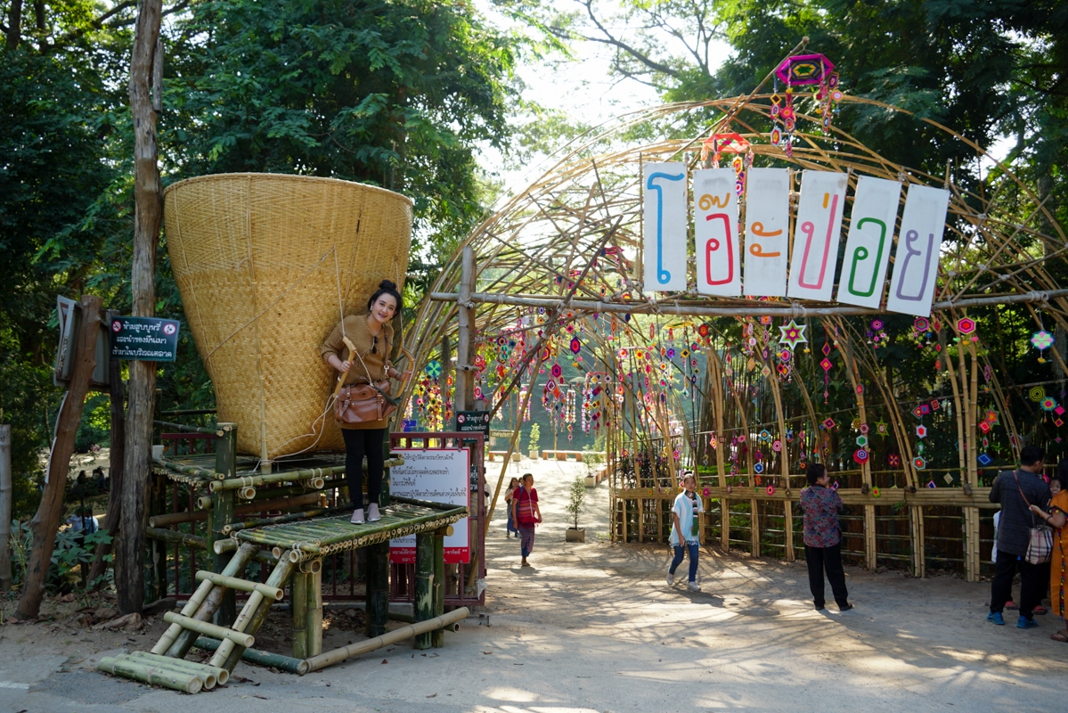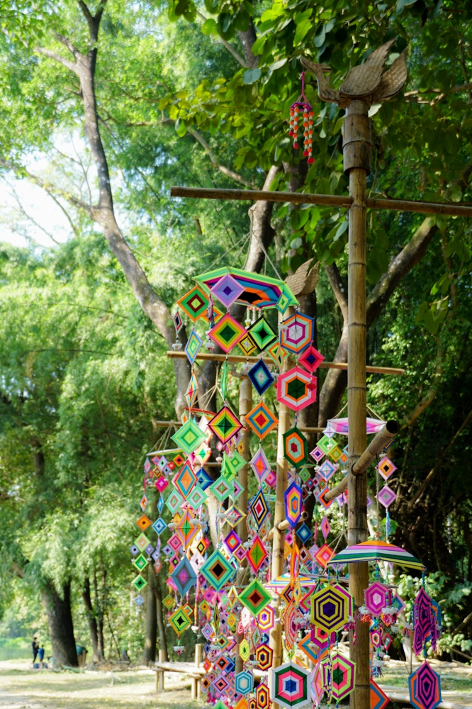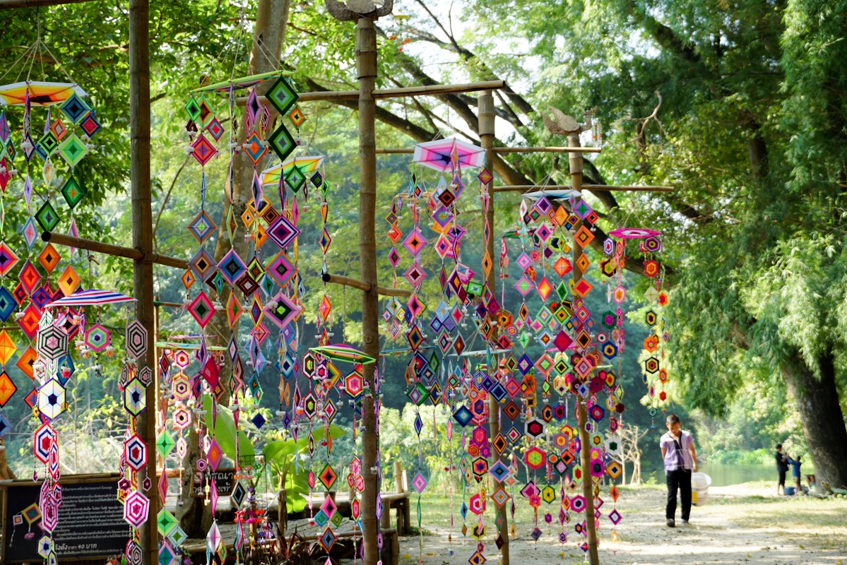 โมบายพื้นเมือง ถูกแขวนตกแต่งบริเวณซุ้มทางเข้า ที่นำจากไม้ไผ่มาจัดเป็นทางเข้า