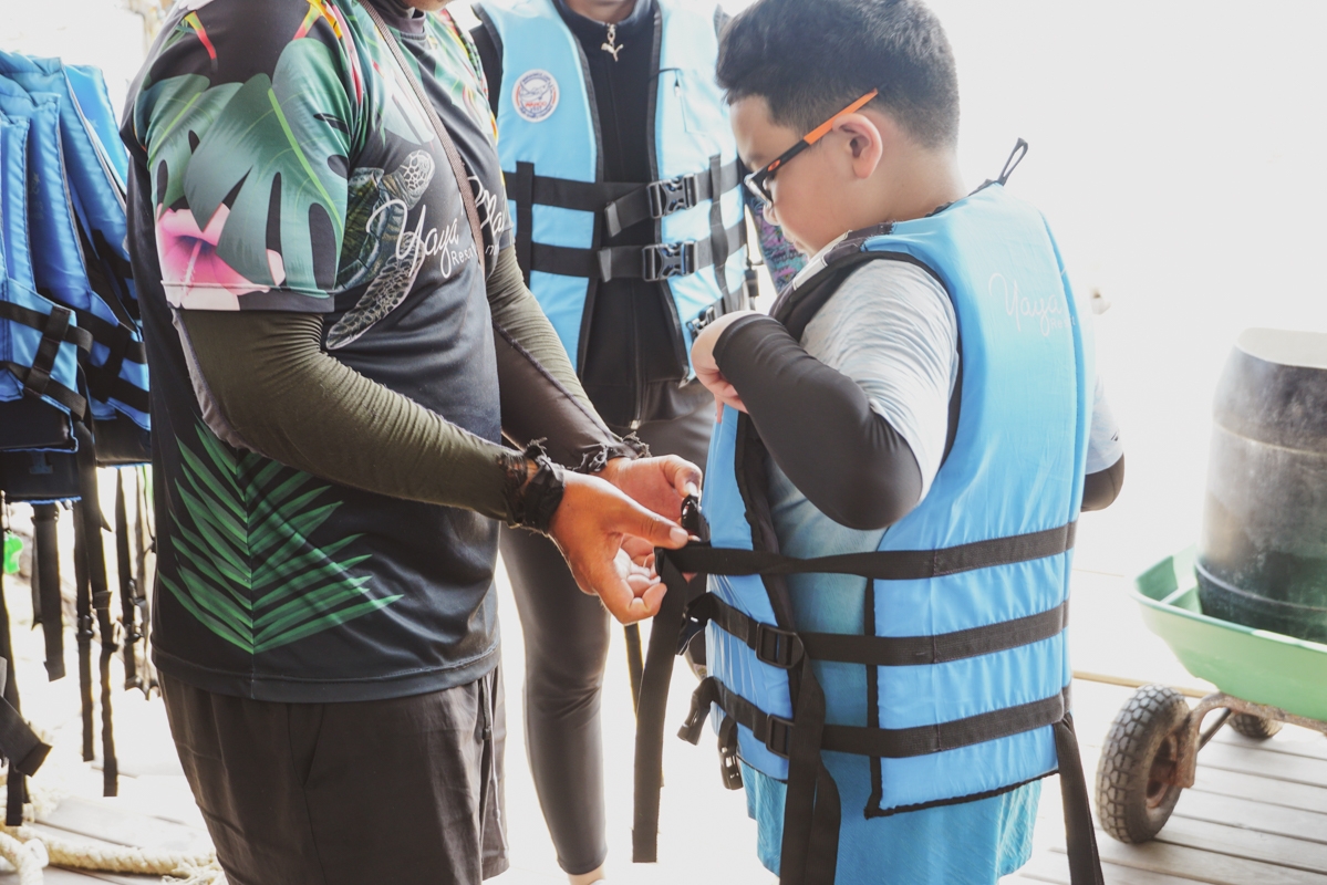 ก่อนเดินทาง มีการใส่ชูชีพ เพื่อรักษาความปลอดภัย ... โดยทีมงานของ Yaya Malee Resort & Snorkeling ดูแลอย่างใกล้ชิด รอบที่แอดไปนั้นคือ 14.00 - 17.00 น.