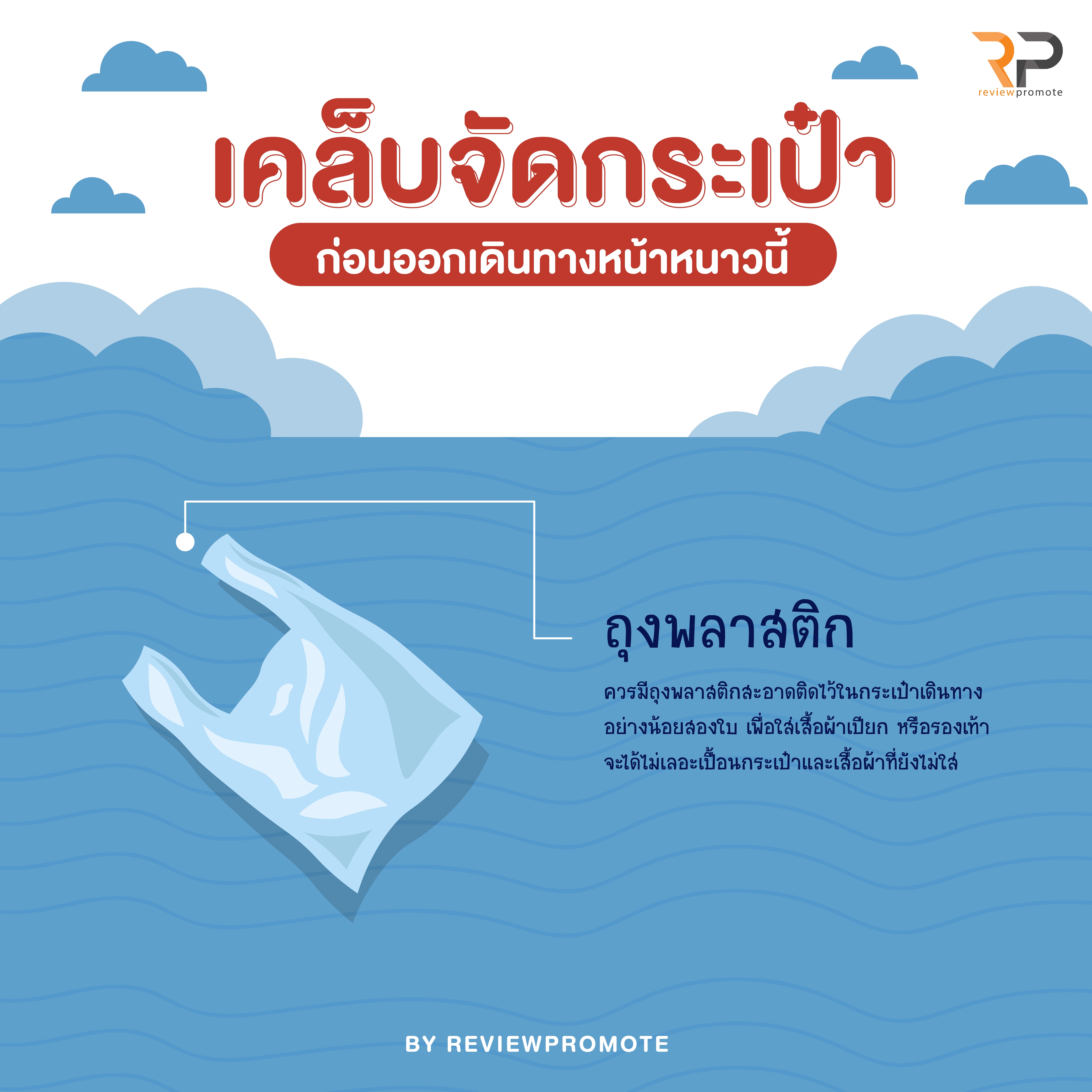 ควรมีถุงพลาสติกสะอาดติดไว้ในกระเป๋าเดินทางอย่างน้อยสองใบ เพื่อใส่เสื้อผ้าเปียก หรือรองเท้าจะได้ไม่เลอะเปื้อนกระเป๋าและเสื้อผ้าที่ยังไม่ใส่