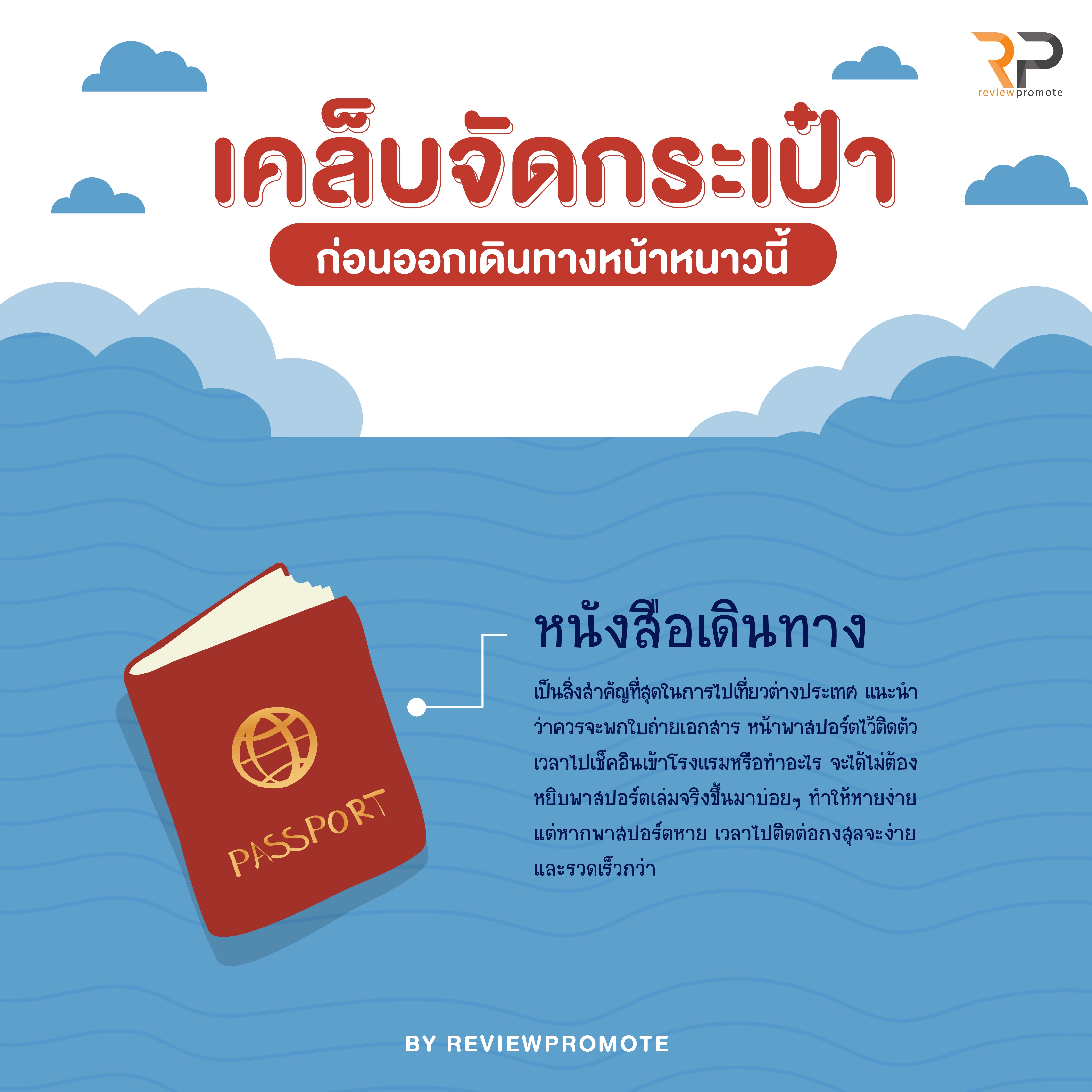 เป็นสิ่งสำคัญที่สุดในการไปเที่ยวต่างประเทศ แนะนำว่าควรจะพกใบถ่ายเอกสารหน้าพาสปอร์ตไว้ติดตัว เวลาไปเช็คอินเข้าโรงแรมหรือทำอะไร จะได้ไม่ต้องหยิบพาสปอร์ตเล่มจริงขึ้นมาบ่อยๆ ทำให้หายง่าย แต่หากพาสปอร์ตหาย เวลาไปติดต่อกงสุลจะง่ายและรวดเร็วกว่า