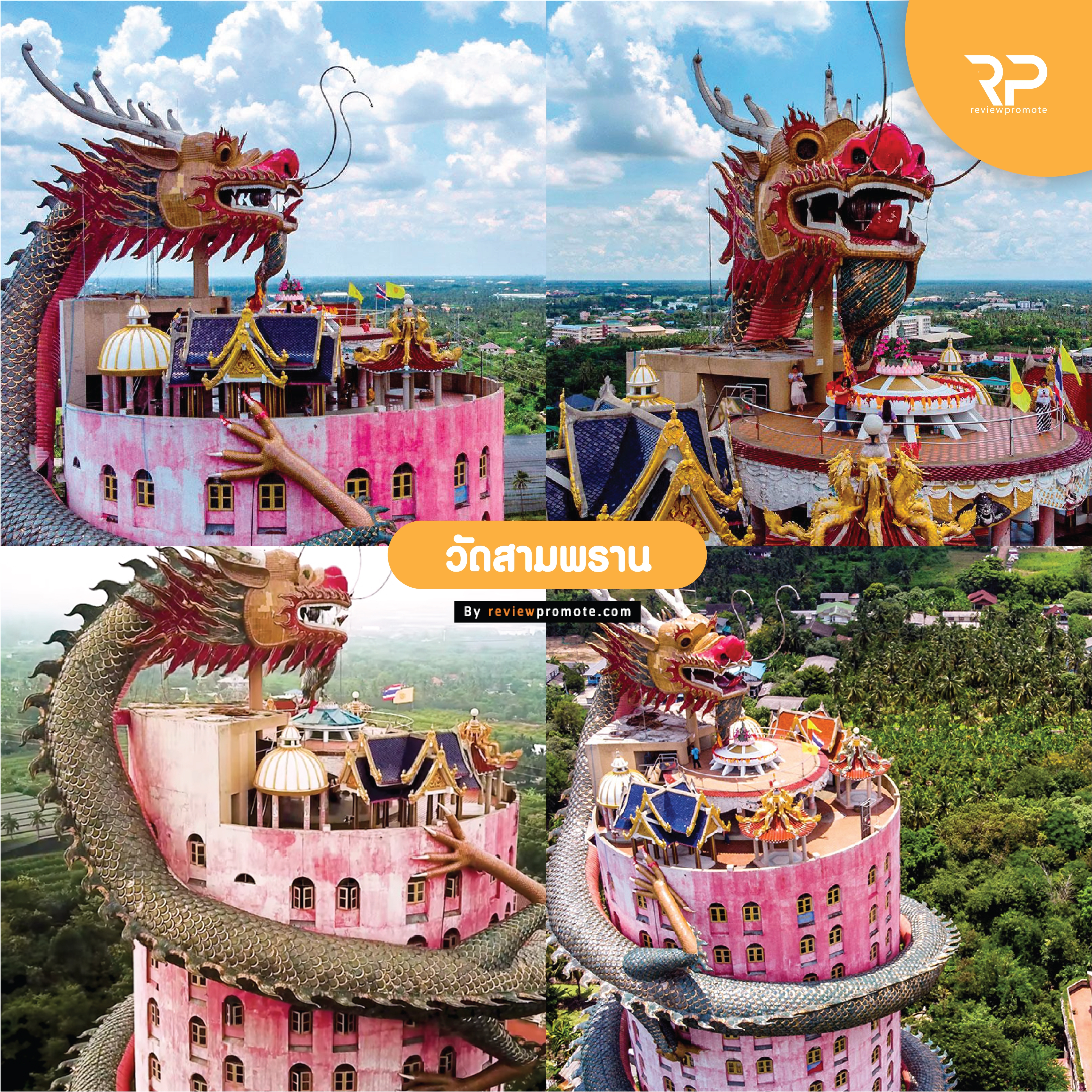 วัดสามพราน ความโดดเด่นของที่นี่ก็คือ สถาปัตยกรรม และประติมากรรมอันงดงาม ตึกที่มีชื่อเสียงที่สุดของวัดคือ ตึกสีชมพูที่มีความสูงถึง 17 ชั้น และมีมังกรตะกายฟ้าโอบรอบสวยงาม