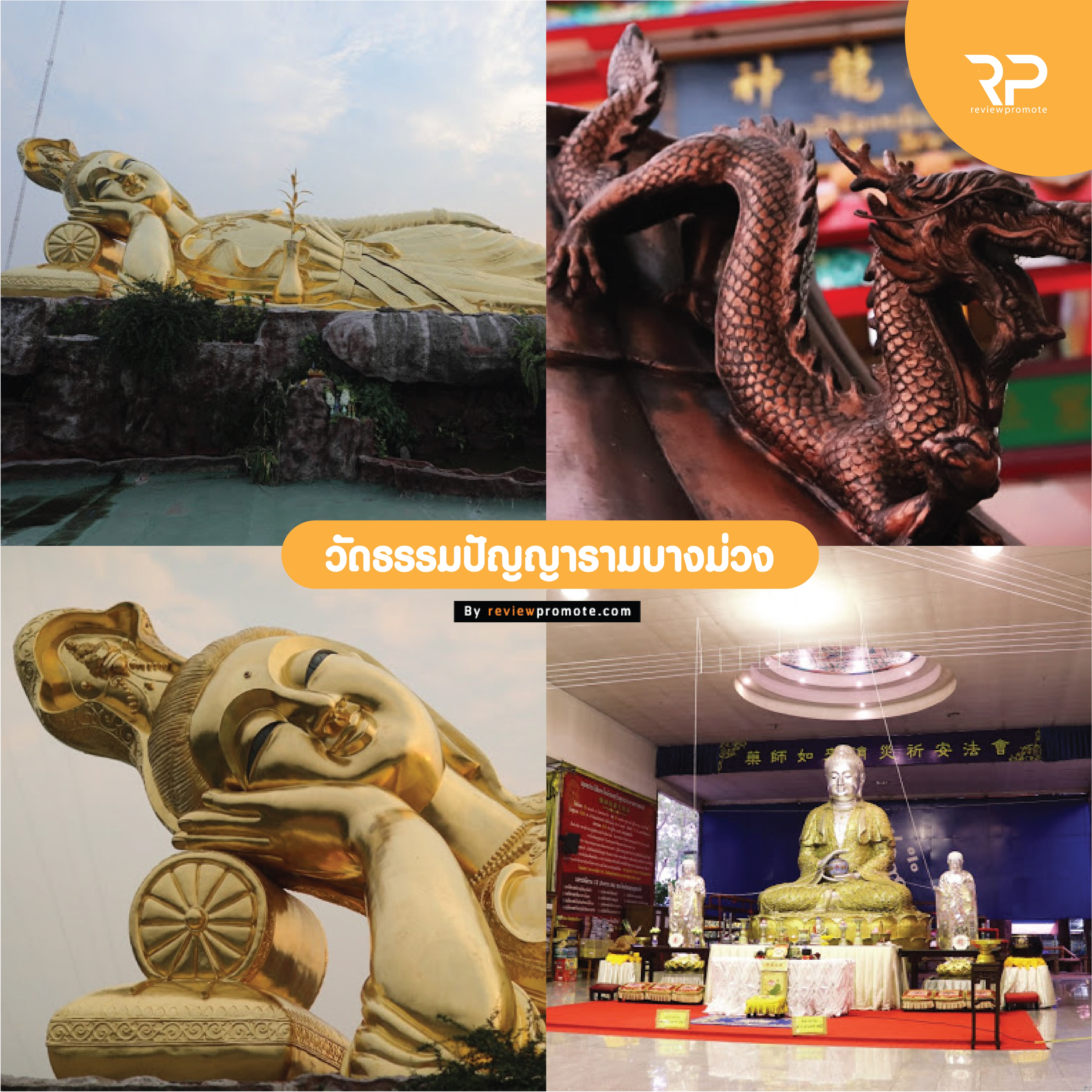 วัดธรรมปัญญารามบางม่วง วัดสวย นครปฐม ที่ตั้งอยู่ริมแม่น้ำท่าจีนแห่งนี้ เป็นวัดที่มีพระแม่กวนอิมในอิริยาบถนอน หรือ พระมหาโพธิสัตว์กวนอิม ปางเสวยสุข ที่ใหญ่ที่สุดในประเทศไทย ซึ่งมีความยาวถึง 21 เมตรค่ะ และที่นี่ยังถือได้ว่าเป็นวัดนิกายมหายานแห่งเดียวของจังหวัดนครปฐมอีกด้วย