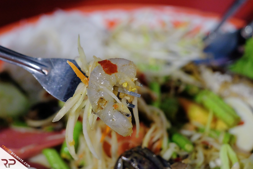 However, this time, we try the Som Tam Tad (som tam platter) *ร้านยกครกส้มตำถาด with crab, fermented fish and fresh shrimp at 200 baht. It’s very spicy and we’ll rate it 8/10.